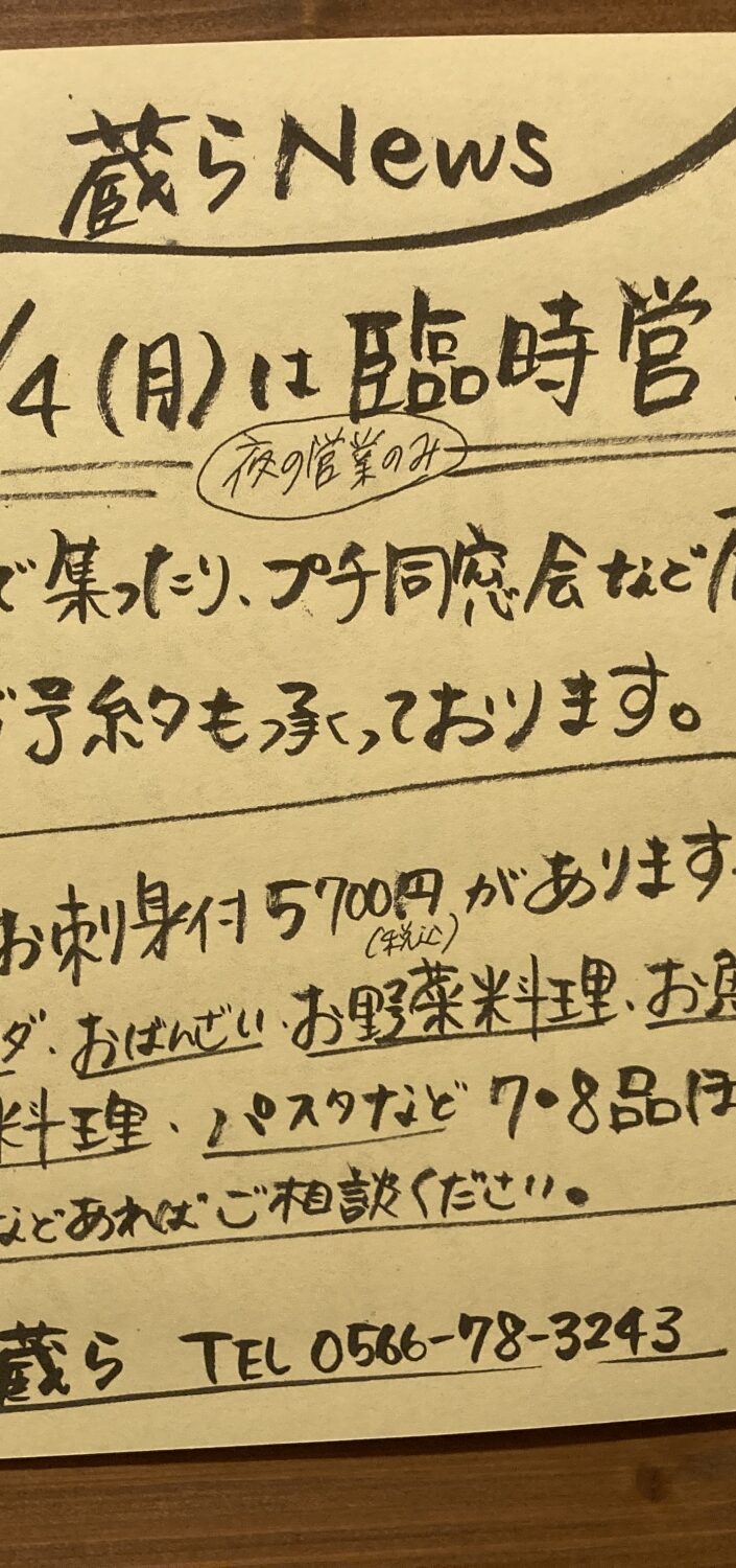 知立の居酒屋、三河スローフードの蔵らです。